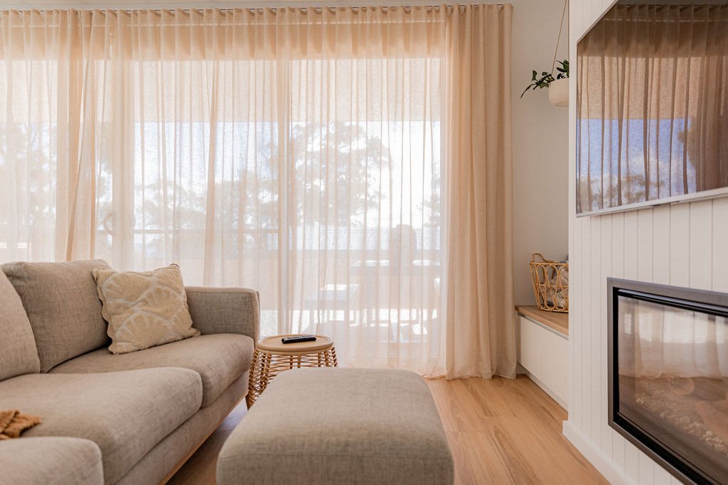 Living room with beige sofa, throw pillows, small wicker side table with remote, large window with sheer beige curtains, wall-mounted TV, and a fireplace.