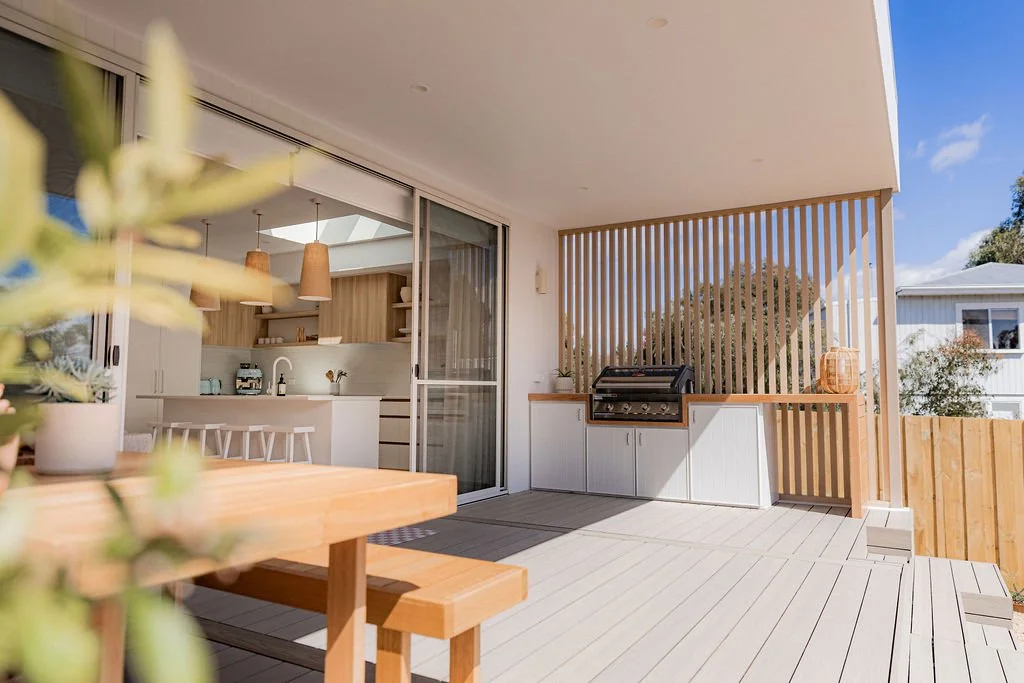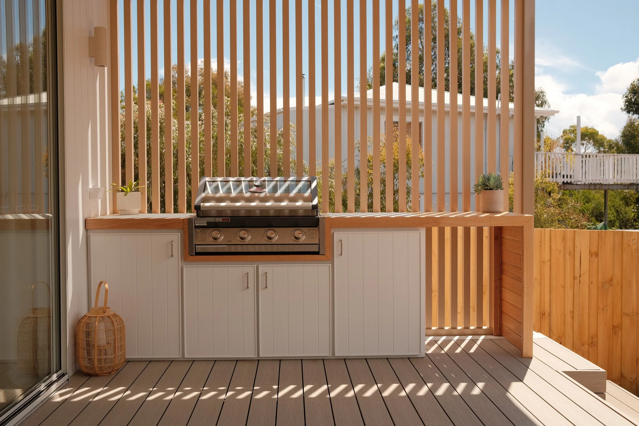 Outdoor patio with a built-in grill, wooden slat privacy screen, and a view into a modern kitchen through sliding glass doors.