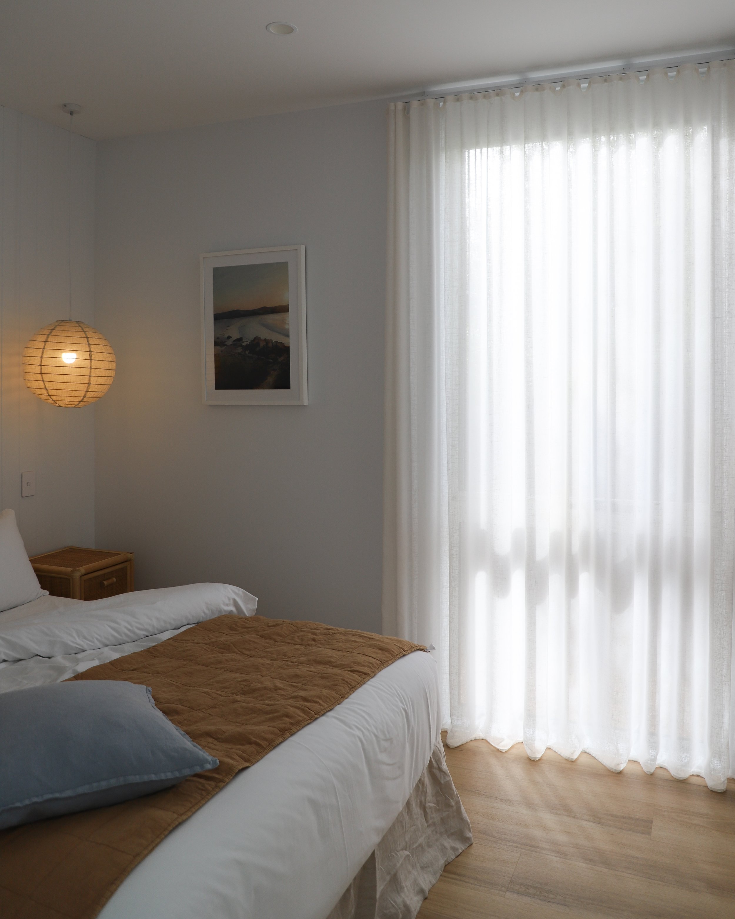 A bedroom with white walls, a bed with white bedding and a brown blanket, a blue pillow, a wooden nightstand, a hanging paper lantern, a framed landscape photo, and sheer white curtains allowing sunlight in.