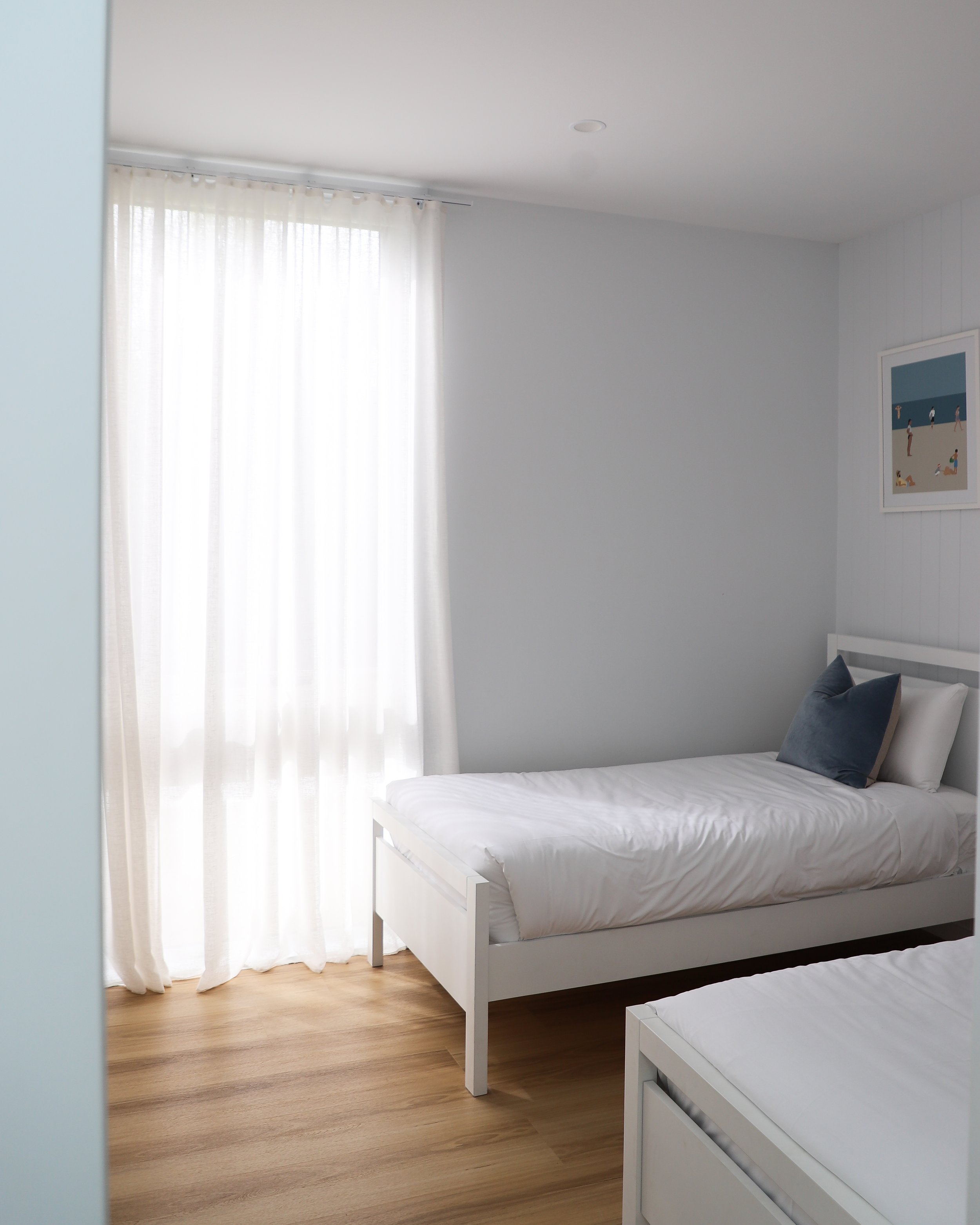 A bright, minimalist bedroom with two white beds, one in the foreground and one in the background, featuring dark blue pillows. The room has light blue walls, a wooden floor, a window with sheer white curtains, and a framed beach scene picture on the