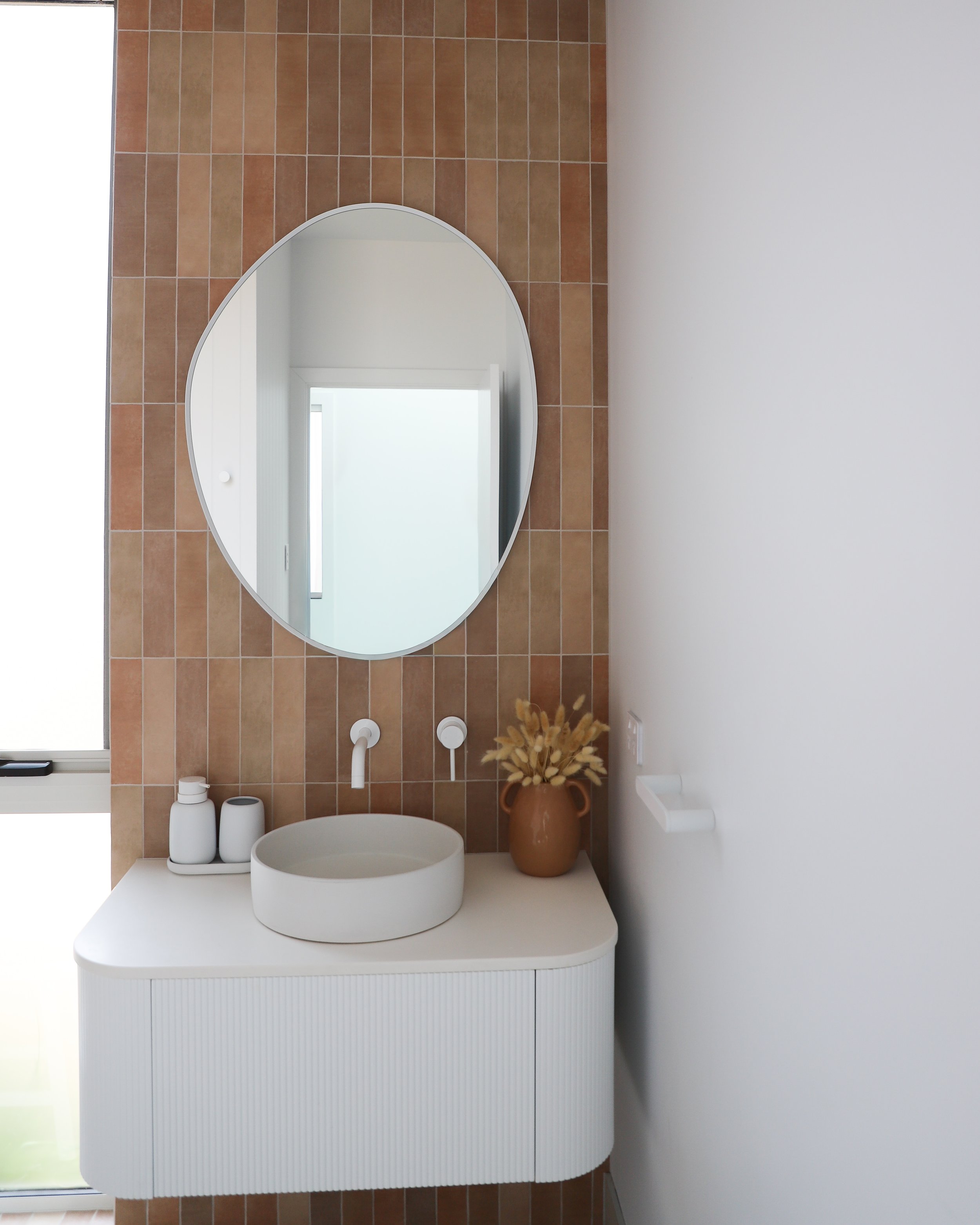 Modern bathroom vanity with a white, round vessel sink, wall-mounted faucet, and brown decorative vase with dried flowers, against a brown tiled wall and a large oval mirror.