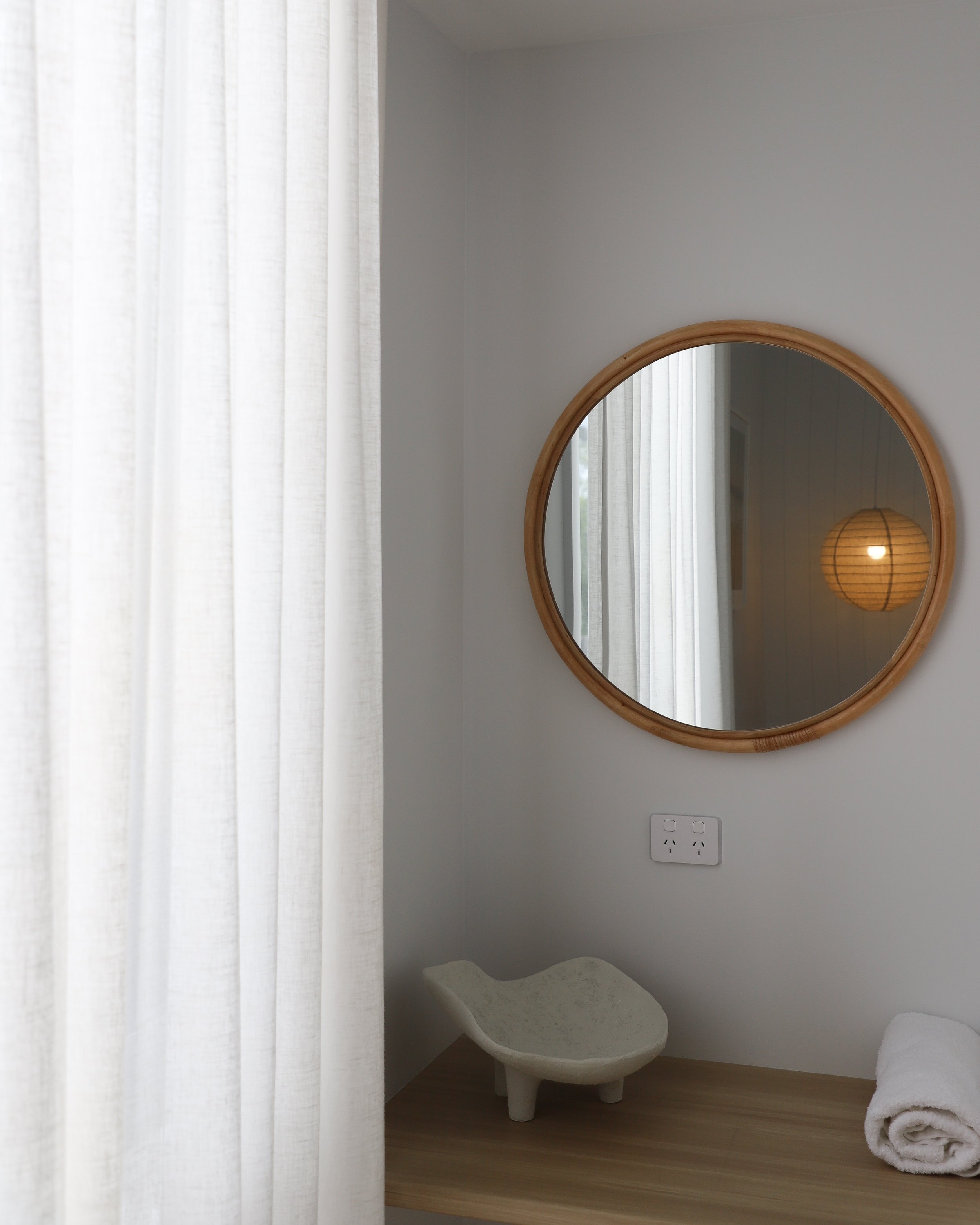 Minimalist interior with white curtains, a round mirror with a wooden frame, a small ceramic stool, a rolled white towel, and a textured wallpaper with a lamp reflected in the mirror.