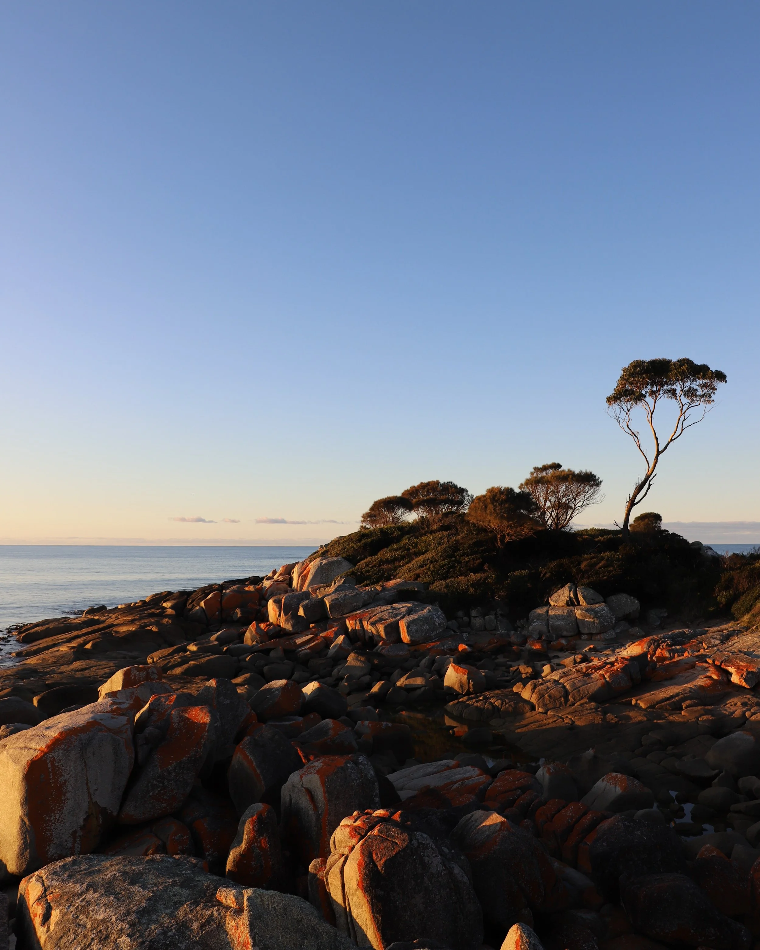 Sunset over a rocky coastline with sparse trees on a small hill, calm ocean in the background, clear sky with few clouds.