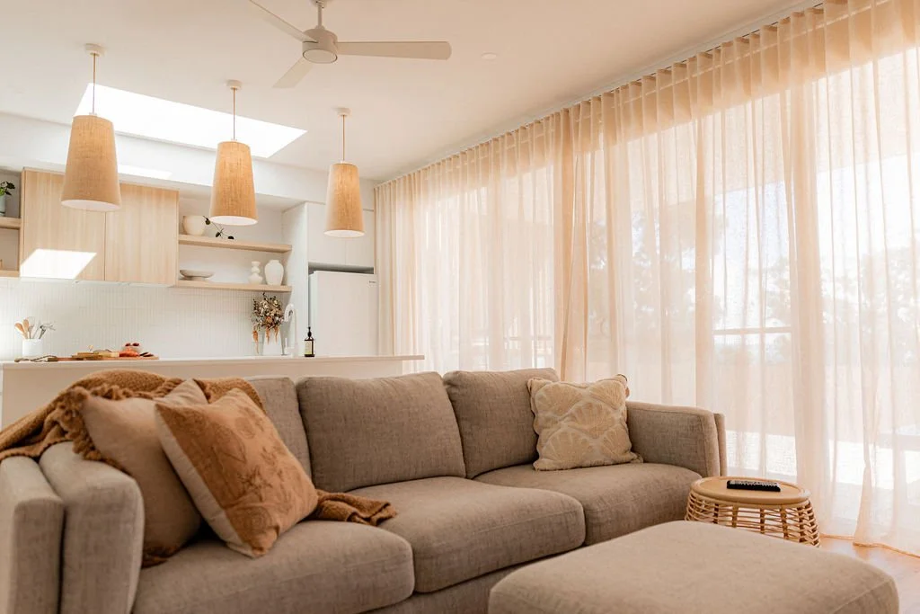 Bright, airy living room with beige curtains, a beige sofa with decorative pillows, a small wicker side table with a remote, and pastel-colored pendant lights over the kitchen area.