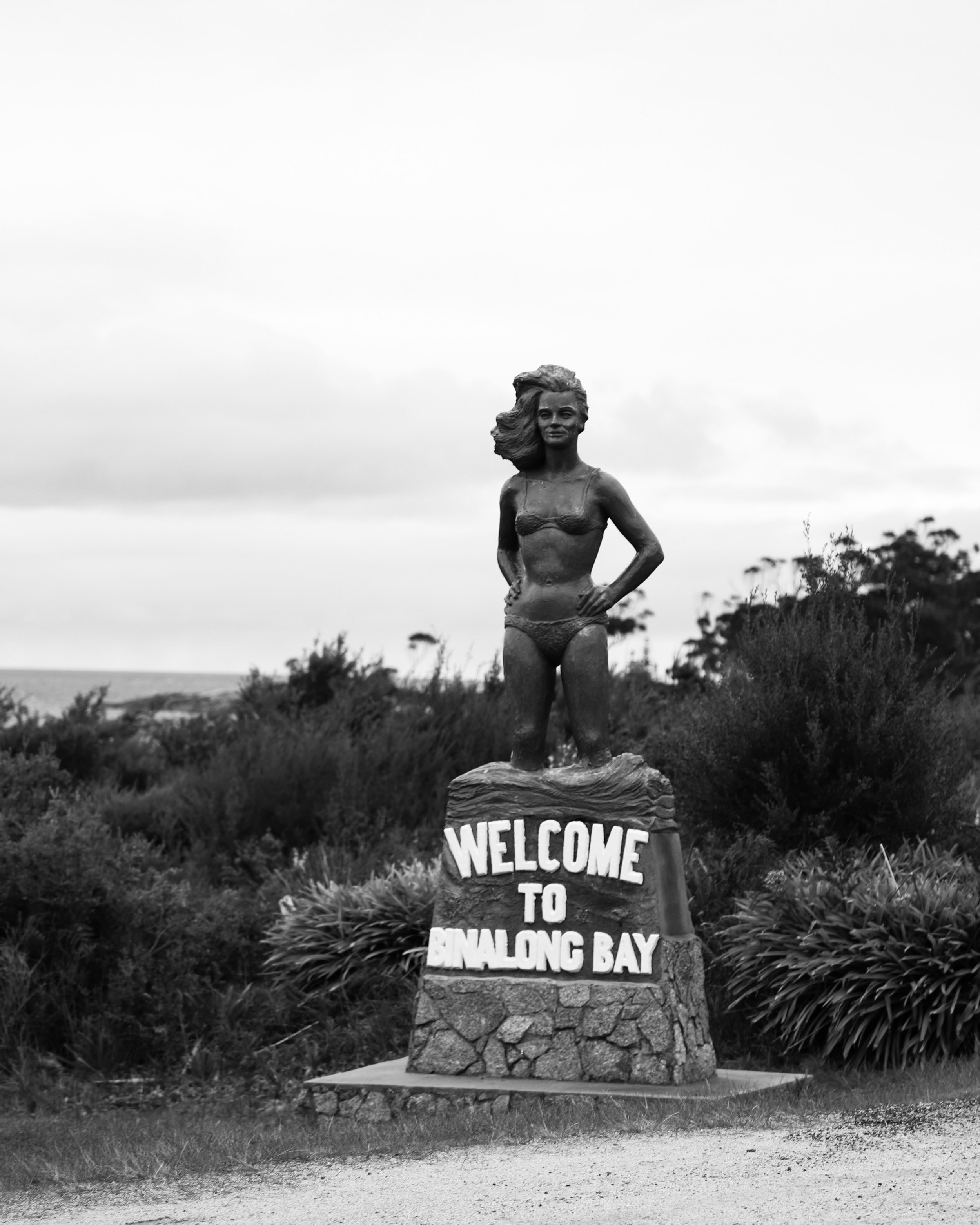 A statue of a woman in a bikini standing on a rock with a sign that reads 'Welcome to Binalong Bay' in a rural outdoor setting.