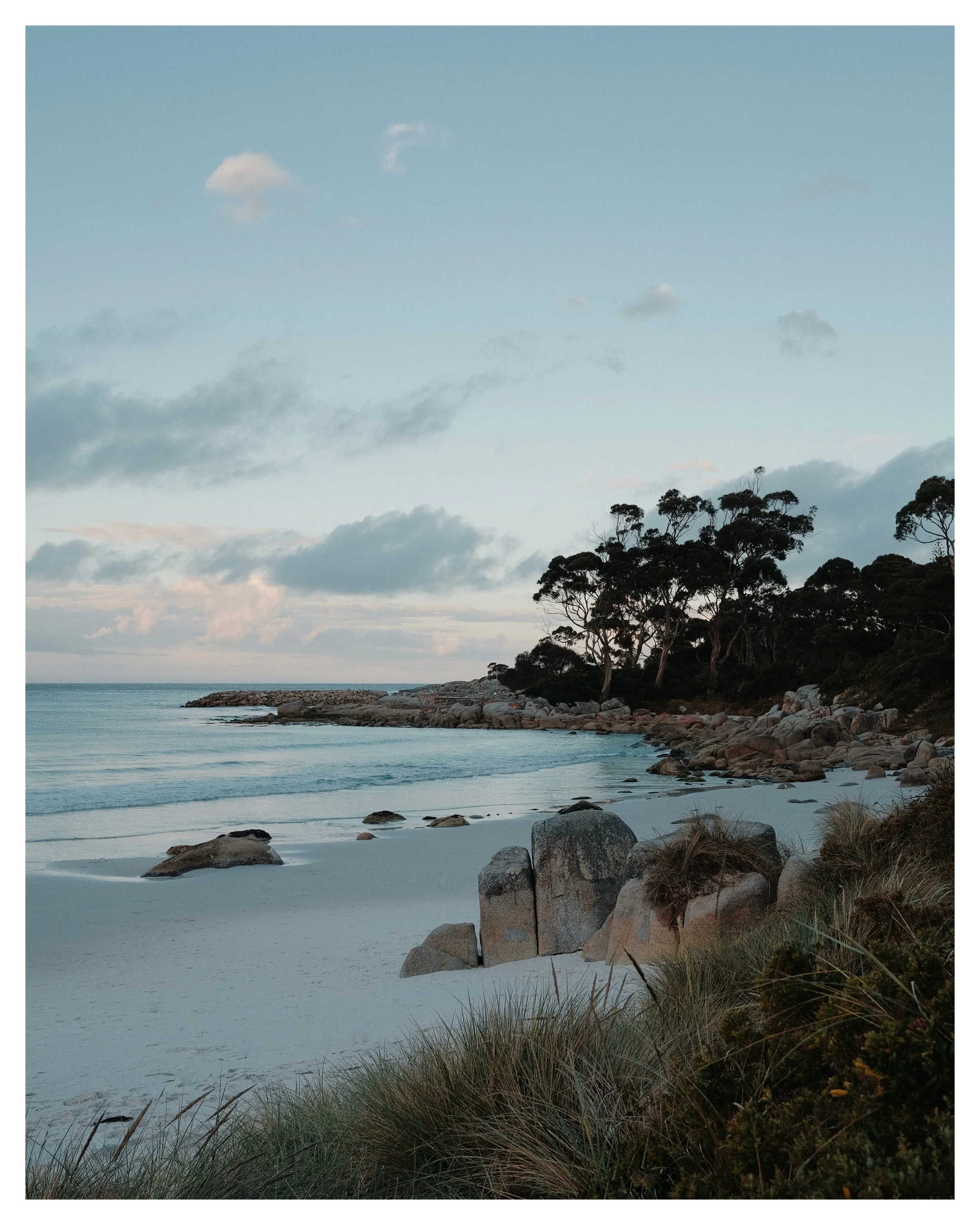 A serene beach scene with sandy shore, rocks, ocean waves, and a backdrop of trees and cloudy sky.