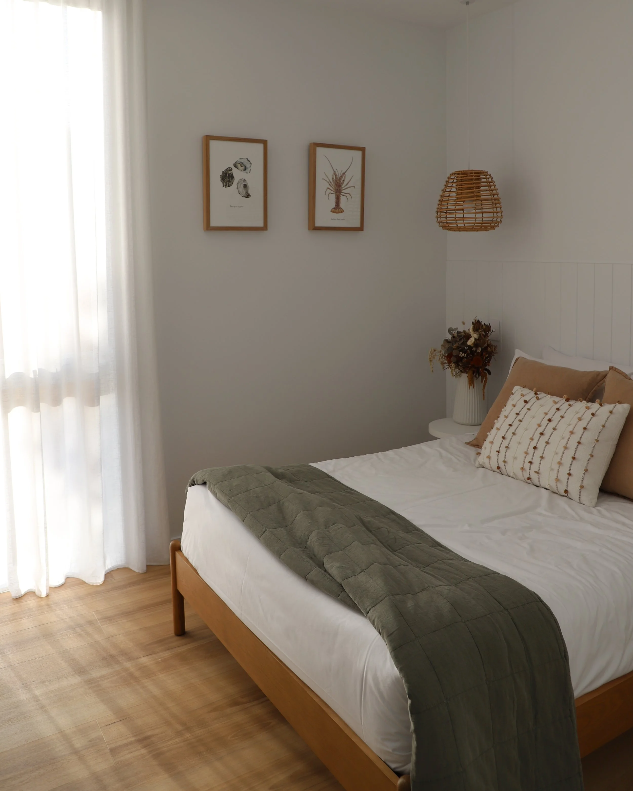 A cozy bedroom with a wooden bed frame, white bedding, a green throw blanket, beige and patterned pillows, a white nightstand with a vase of dried flowers, framed artwork on the wall, wicker pendant light, and sheer curtains letting natural light in.