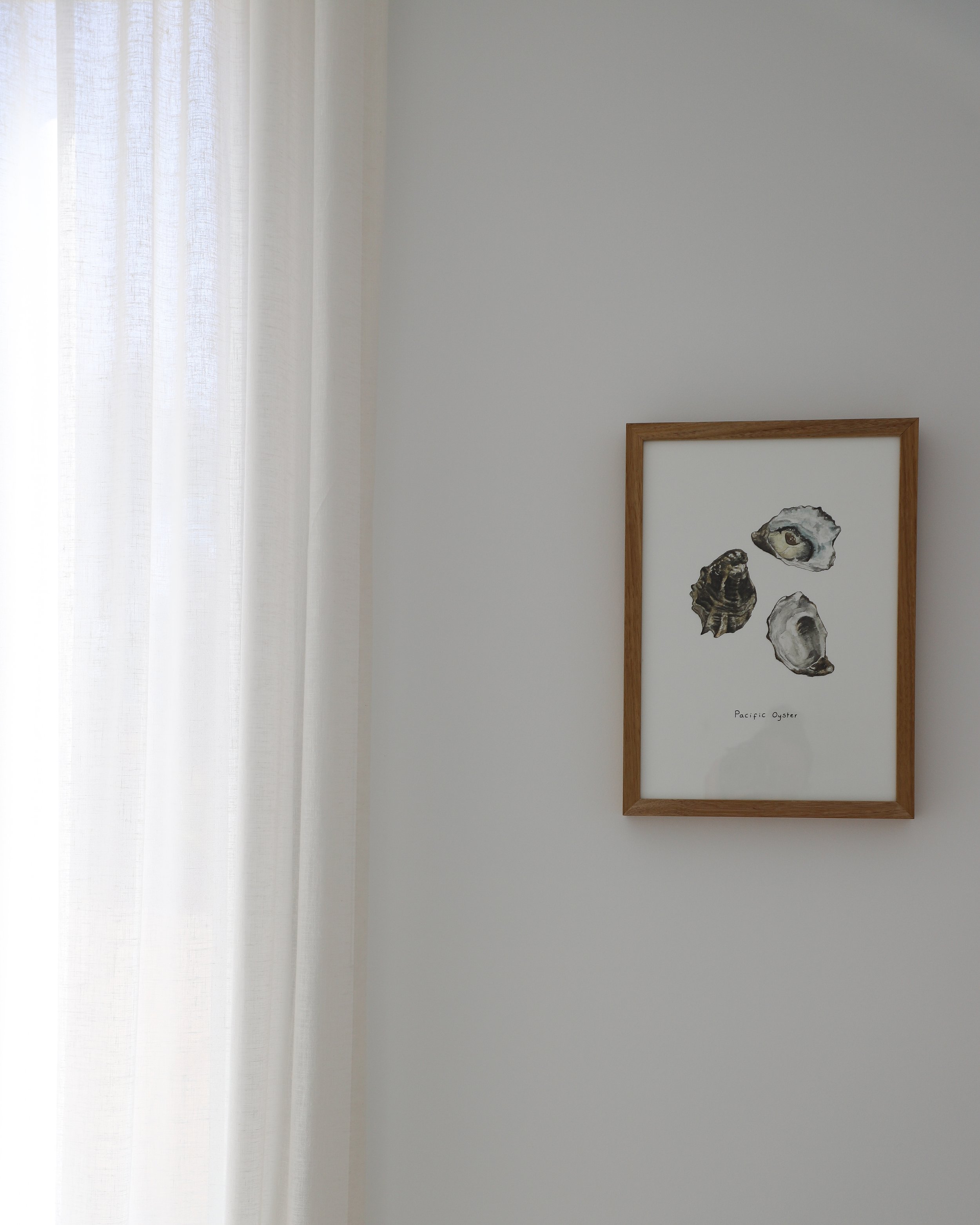 A framed illustration of three Pacific oysters hangs on a white wall next to a window with sheer white curtains.